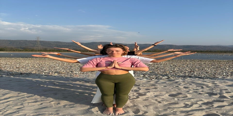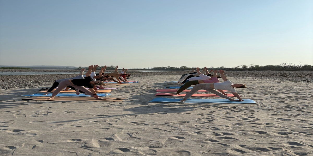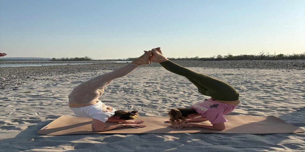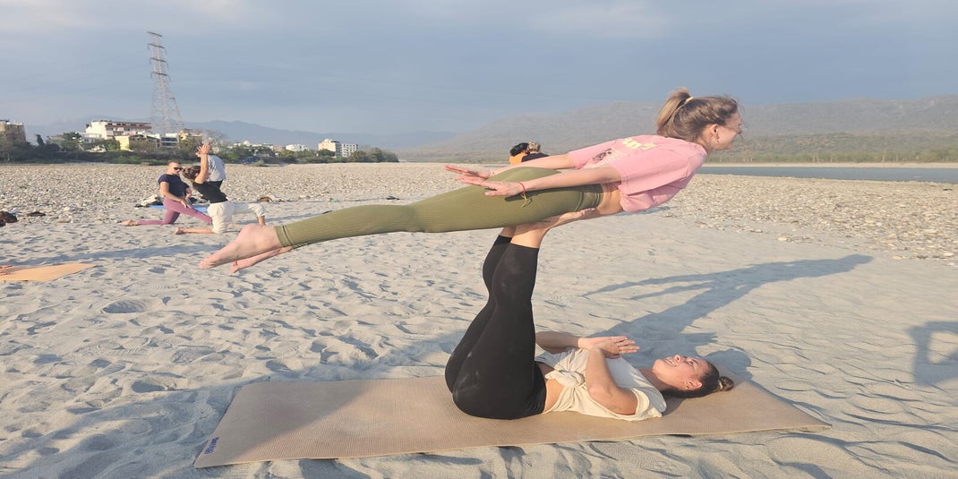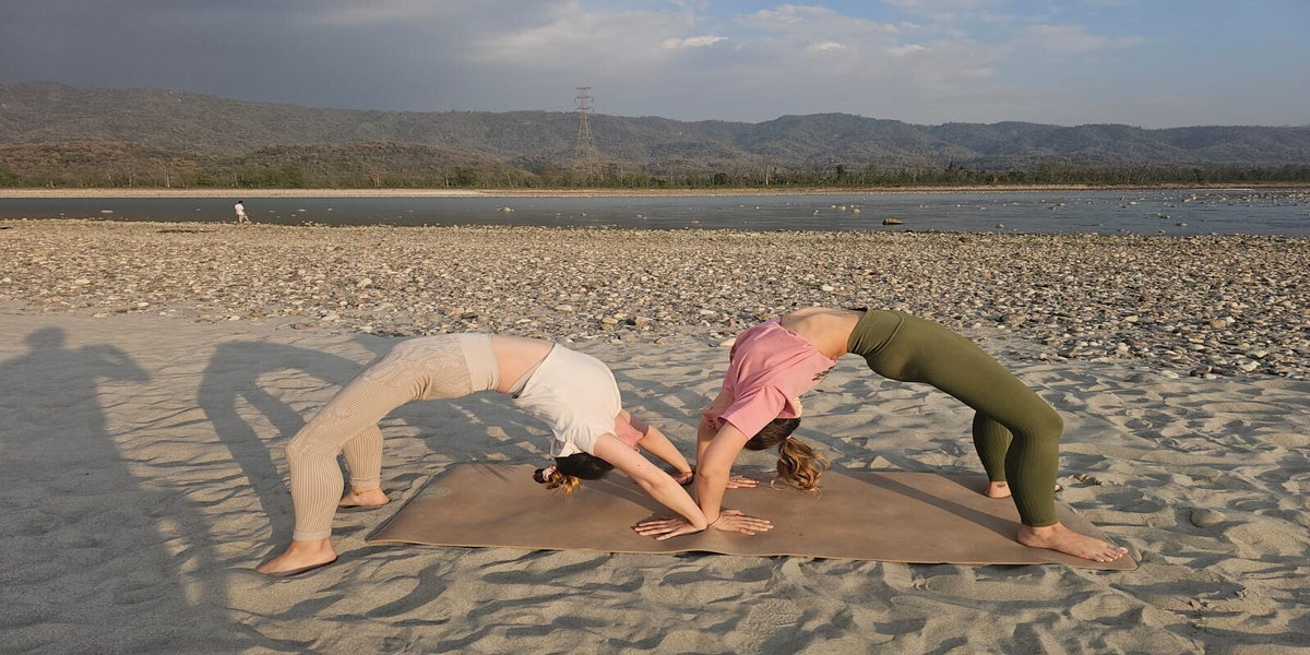 Am späten Nachmittag machten wir uns dann auf den Weg zum Fluss, um dort Beach Yoga zu praktizieren. Es war ein besonderer Ort – ruhig, weitläufig, mit dem sanften Rauschen des Wassers im Hintergrund. Doch diesmal gab es keine festen Vorgaben, keine klassische Unterrichtsstruktur. Wir durften einfach kreativ sein, die Bewegung genießen, mit den Asanas spielen und gemeinsam lachen. Einige von uns machten Partner-Yoga, andere probierten akrobatische Posen aus oder flossen intuitiv durch ihre eigenen Sequenzen. Dabei entstanden wunderschöne Fotos, die diese unbeschwerte, lebendige Energie festhielten.