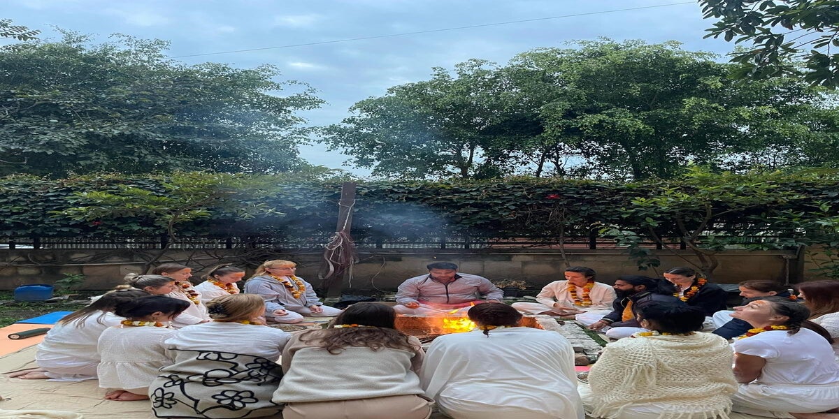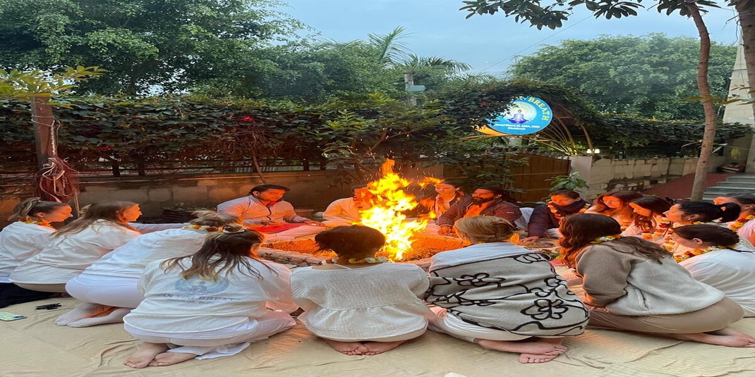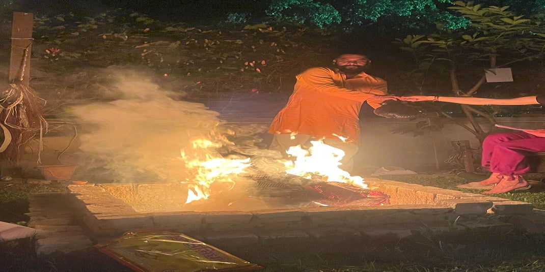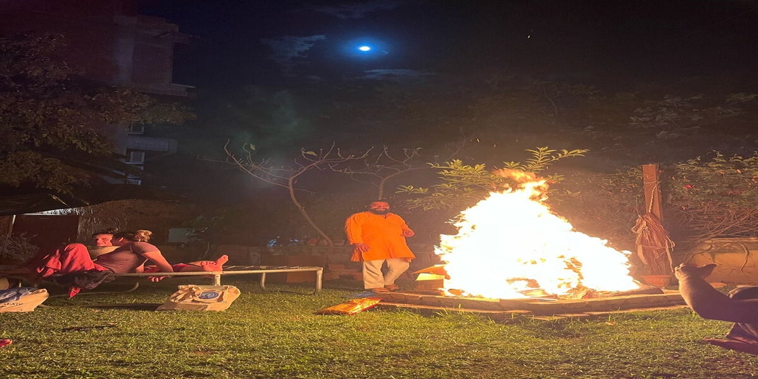 Der Tag begann mit einer kraftvollen Feuerzeremonie. 🔥 Trotz meiner Müdigkeit war ich ganz präsent. Die Flammen loderten, Sanskrit-Mantras erfüllten die Luft, und für einen Moment war mein Geist vollkommen ruhig.